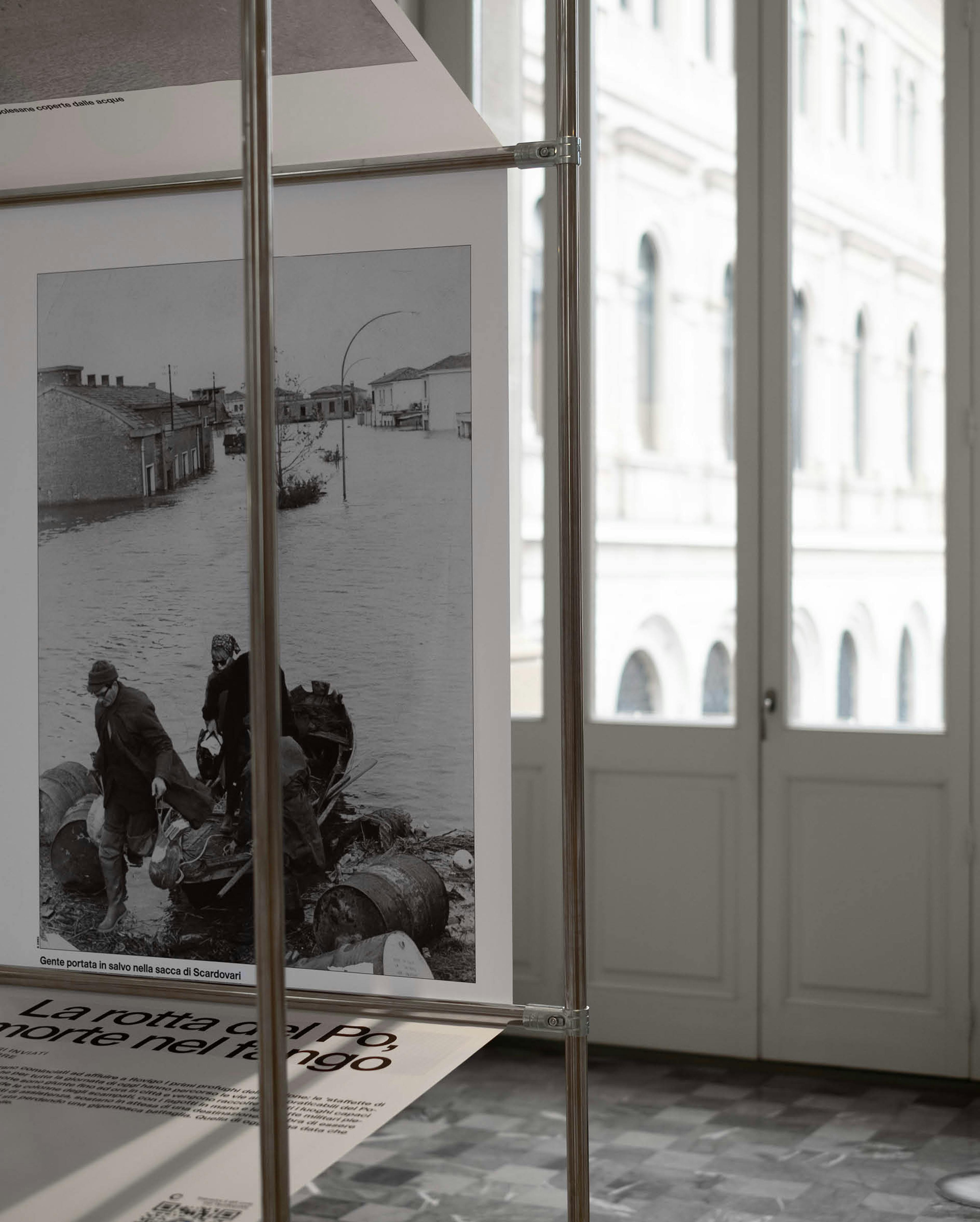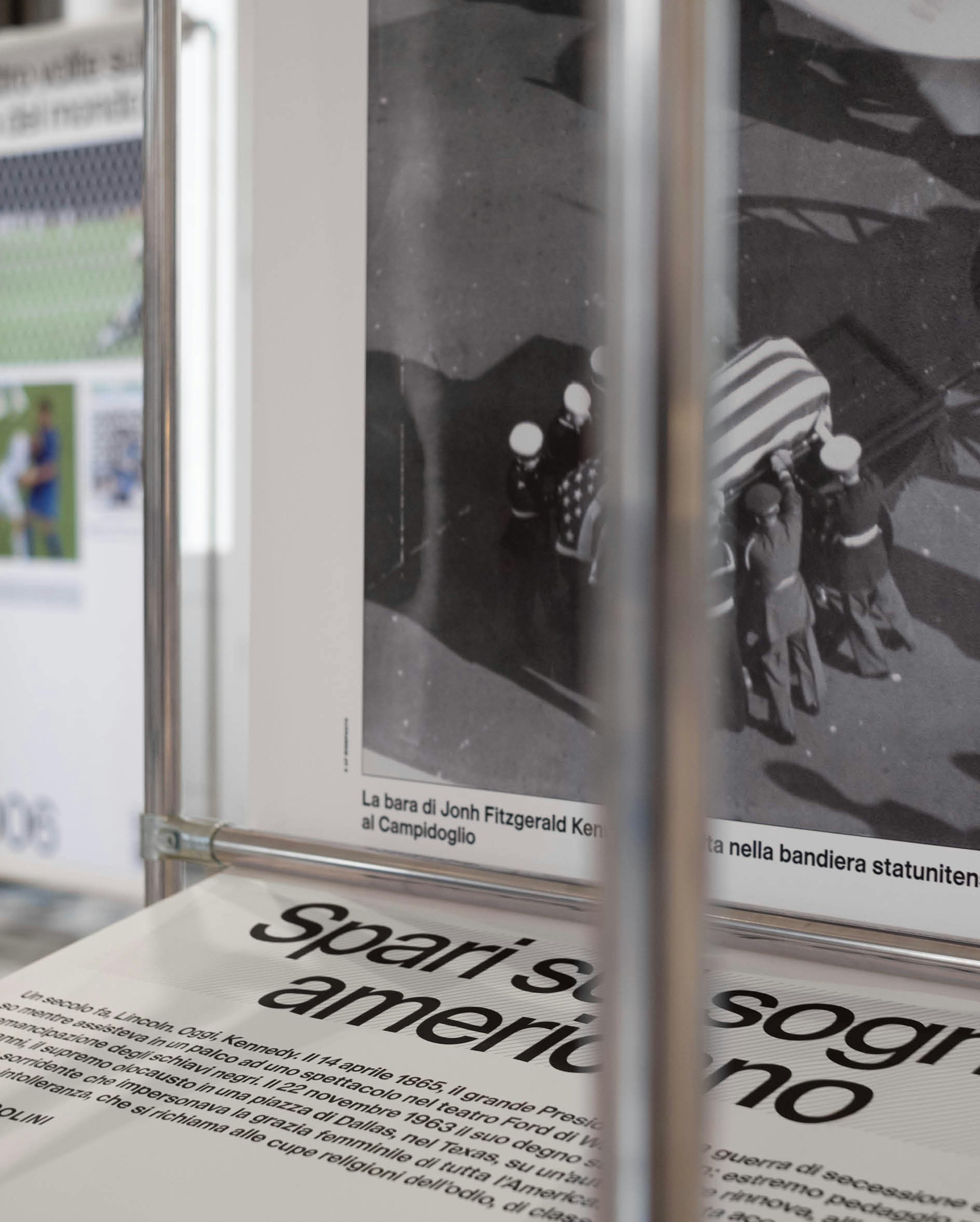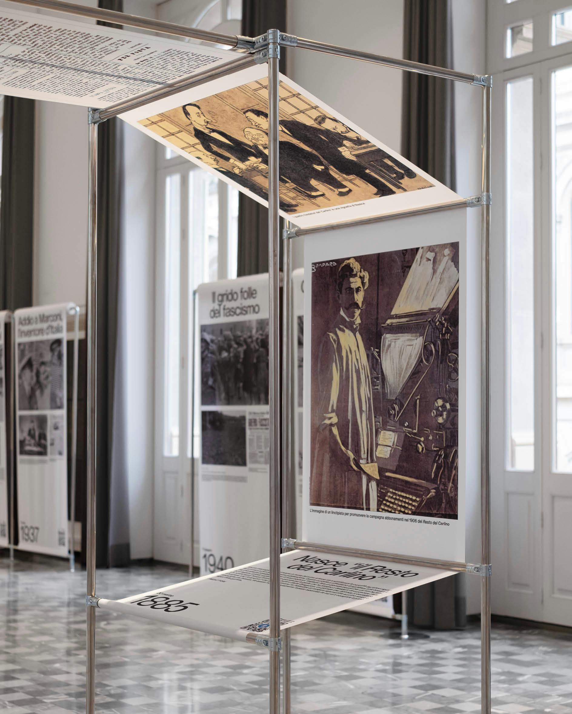 The exhibition design takes inspiration from the newspaper’s own production process: images and texts are printed on large suspended fabrics that recall the paper reels of printing presses, evoking the continuous movement, rhythm and materiality of daily news production. Visitors move through a space where information unfolds as it once did in print—layered, dynamic and in constant circulation—transforming journalistic memory into a spatial and visual narrative.
